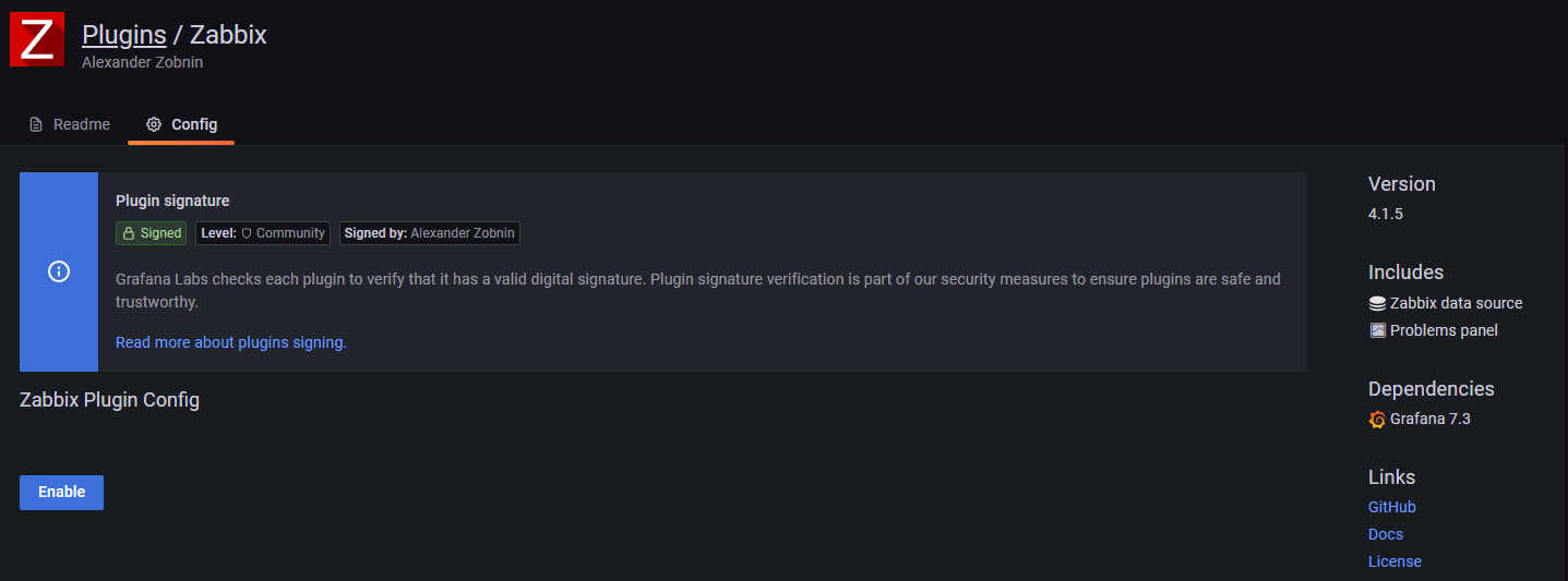 Zabbix가 enable 되어 있으면 아래와 같은 화면을 활성화가 되어 있지 않으면 위와 같이 Enable 버튼을 보실수 있습니다. plugin이 활성화 되어 있으면 이단계를 넘어가시고 활성화 되어 있지 않으시면 활성화 해주시면 됩니다.