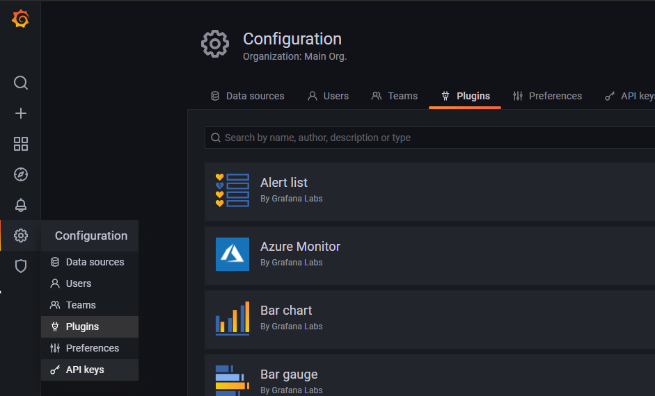 Grafana의 Configuration의 Plugins 메뉴를 Click하면 설치되어 있는 plugin을 확인 하실수 있습니다.